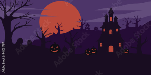 abstract landscape halloween poster with house or castle and pumpkin illustration design
