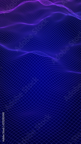 Abstract landscape on a blue background. Cyberspace grid. Hi-tech network, technology. Vertical image orientation. 3D illustration