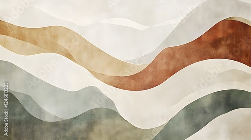 Abstract Landscape, Watercolor Texture, Beige, Brown, Green, Gray Waves, Minimalist Modern Art, Organic Background Design