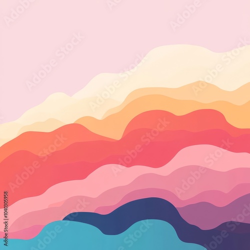 Abstract landscape with layered, wavy shapes in soft pastel colors.