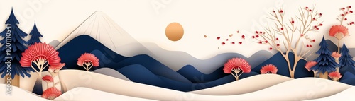 Abstract landscape with red flowers, blue hills, and a soft light.