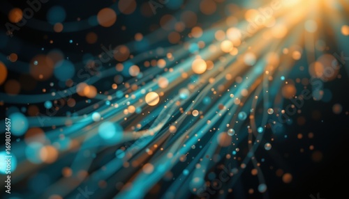 Abstract light effect with turquoise tones and golden reflections on black background, subject on right, ample copy space on left, clean and minimal for photo.