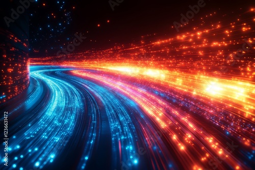 Abstract light speed background with blurred blue, orange, and red lines, symbolizing high-speed data transfer or futuristic transportation.