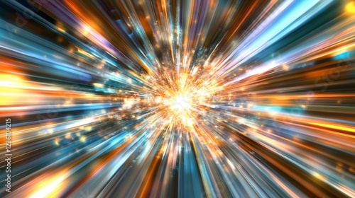 Abstract light speed burst with blue and gold beams converging at the center