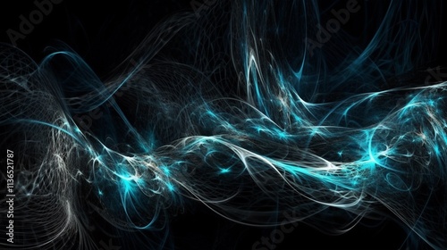 Abstract light waves in white and light blue colors and black background, banner, wallpaper