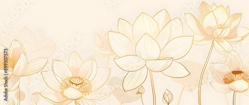 Abstract line art lotus flowers in beige and gold on cream background, vector illustration, contour, no shadows, highly detailed