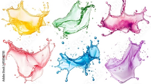Abstract Liquid Splashes: Splashes of liquid in various colors, frozen in dynamic shapes, set against a white background.