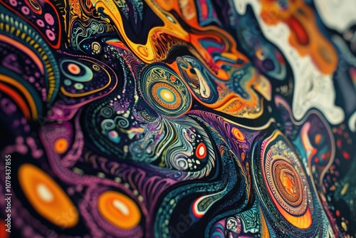Abstract mandala in psychedelic colors, with bold, intricate patterns swirling and twisting in a hypnotic design