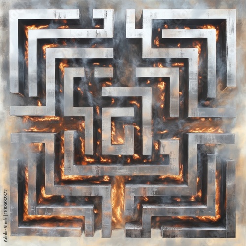 Abstract metal maze with fiery accents creating a striking visual effect.