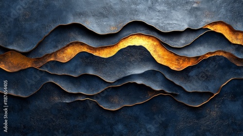 Abstract metallic landscape in gold and blue with textured waves and layers