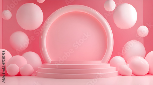 Abstract minimal scene with round podium Abstract background with podiums and pink balloons Abstract minimal scene with geometrical forms. Pink cream background Podium, studio or stage design template