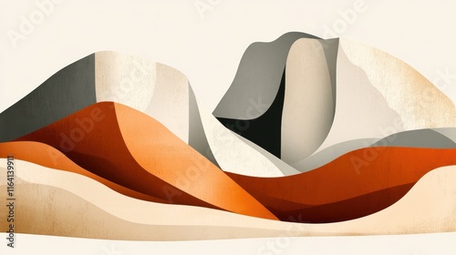 Abstract minimalist landscape art with orange and beige dunes and gray mountains.