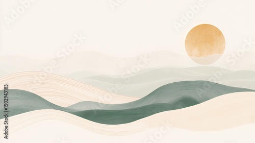 Abstract Minimalist Landscape With Sun And Rolling Hills