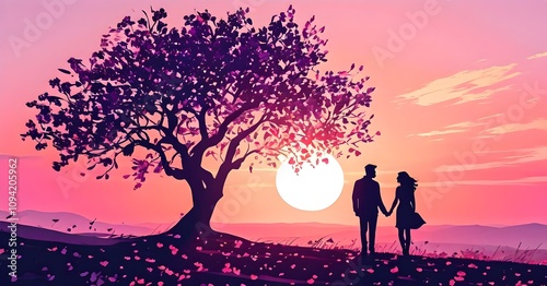 Abstract minimalist spring scene with a single, sharp silhouette of a couple and a blooming tree, hinting at spring freshness