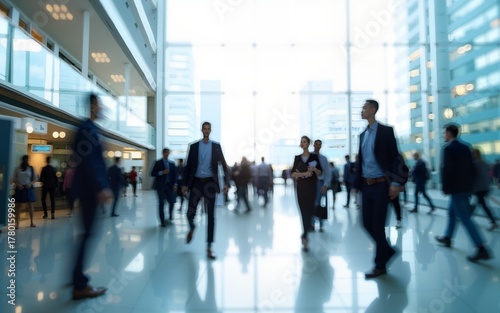 Abstract motion blur image of business people crowd walking at corporate office in city downtown, white blurred background, business center concept. Generative AI. High quality