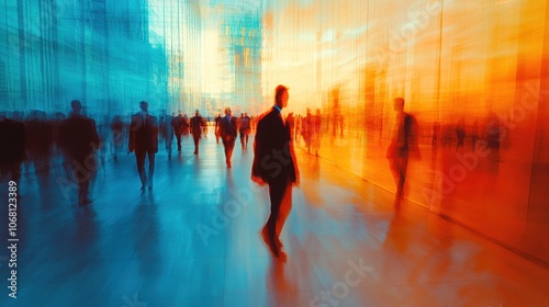 Abstract Motion Blur of Business People Walking in Modern Urban Environment with Vibrant Colors and Reflections