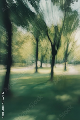 Abstract Motion Blur of Trees in Park, Green Landscape, Artistic Impression, Summer Day, Outdoor Scene