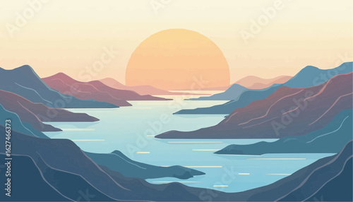 Abstract Mountain Landscape with Sunset over Water in Soft Pastel Colors