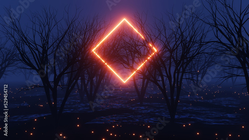 abstract mystical forest in the dark with fog and glowing objects, 3d render