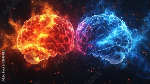 Abstract neon art of brain connectivity, showcasing right and left cerebral hemispheres, ideas, creative thinking, intelligent network, anatomy, information processing, and neuro patterns