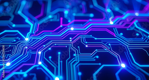 Abstract neon circuit board background. Glowing blue and green lines connecting in complex patterns