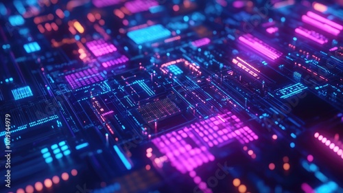 Abstract Neon Circuit Board with Glowing Lines and Dots