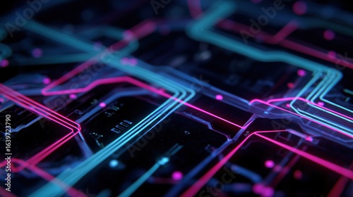 Abstract Neon Circuit Network Background, Futuristic Data Transfer Tech Concept for AI, Blockchain and Cybersecurity Presentations in 4K Ultra-Realistic Detail