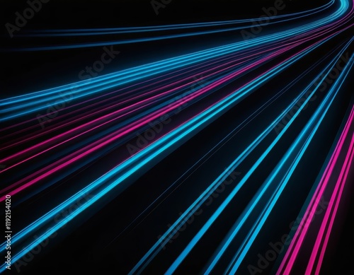 Abstract Neon Light Trails: Dynamic Pink and Blue Glowing Lines on Black Background, Futuristic Speed and Technology Concept