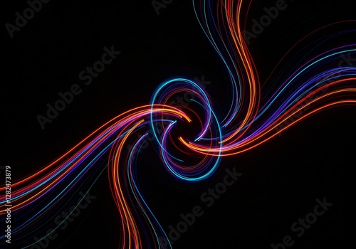 Abstract neon light trails forming dynamic curved patterns on a dark background