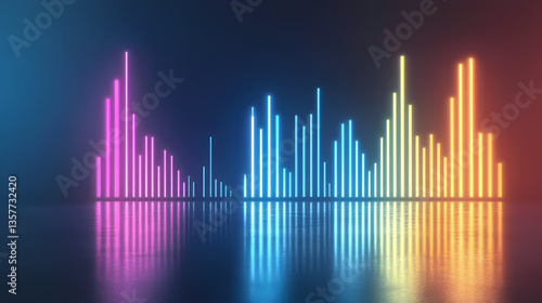 Abstract neon music equalizer bars floating on a dark gradient background, glowing modern tech design