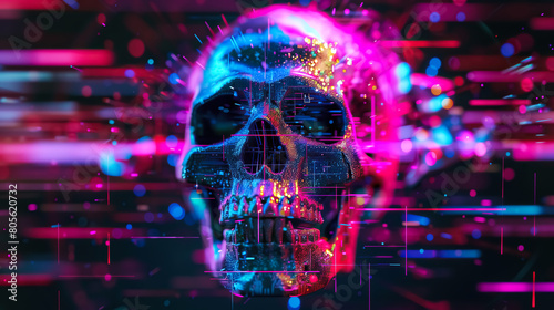 abstract neon style human skull with dynamic lines explosive dots modern futuristic aesthetic background