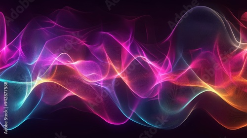 Abstract Neon Waves in Pink, Yellow and Blue on a Black Background.