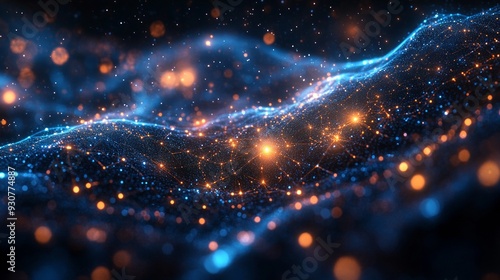 Abstract network background image with bright glowing nodes and lines on dark background creating waves of technology, data and digital communication. Web science and technology.