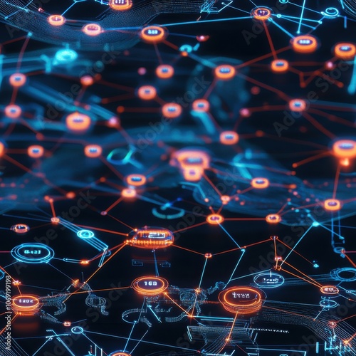Abstract network connections with glowing nodes and lines on dark background, representing digital data flow and technology.