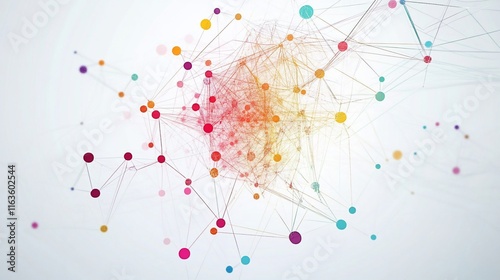 Abstract network graphic with interconnected colorful dots and lines.