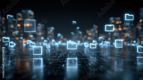 Abstract network grid with files and folders, futuristic software interface, digital document management system, store, search and organize documents, corporate business, paperless office