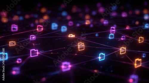 Abstract network grid with files and folders, futuristic software interface, digital document management system, store, search and organize documents, corporate business, paperless office