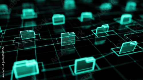 Abstract network grid with files and folders, futuristic software interface, digital document management system, store, search and organize documents, corporate business, paperless office