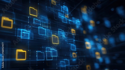 Abstract network grid with files and folders, futuristic software interface, digital document management system, store, search and organize documents, corporate business, paperless office