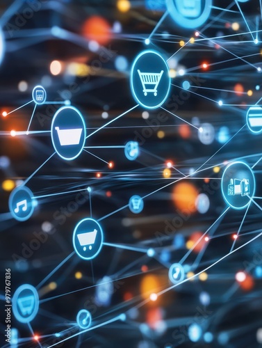 Abstract network of connected icons symbolizing online shopping and e-commerce on a digital interface with a depth of field effect.