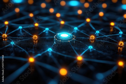 Abstract network of glowing blue and orange interconnected points on dark background, futuristic technology concept, intricate network design, dots and lines, illuminated nodes, technology and
