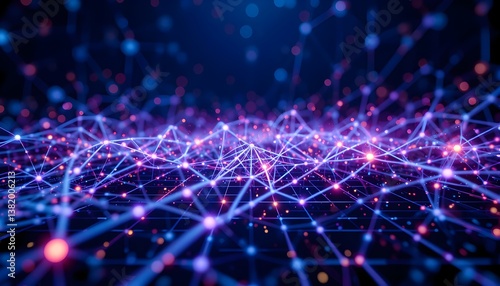 Abstract network of interconnected nodes and lines against a dark blue background evoking connectivity and technology