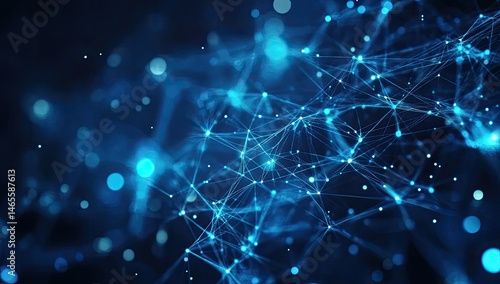 Abstract network of interconnected points and lines. A complex, dynamic system of data streams and connections. Intricate patterns of glowing blue particles and lines