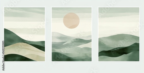 Abstract Nordic Landscape in Three Simple Posters Featuring Pale Green Tones, Simple Shapes, and Lines. Minimalist Design with a Scandinavian Touch on a Clean Background.