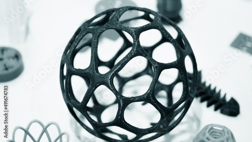 Abstract object of a blue color printed on a 3d printer on a white table. Fused deposition modeling, FDM. Progressive modern additive technology. Concept of 4.0 industrial revolution