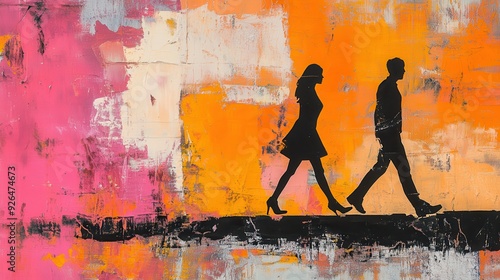 Abstract oil painting of silhouette man and woman walking, urban street art