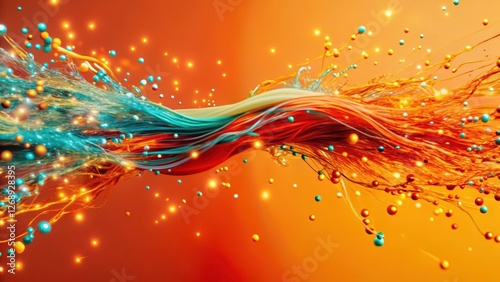 Abstract Orange and Teal Liquid Flow with Glowing Particles