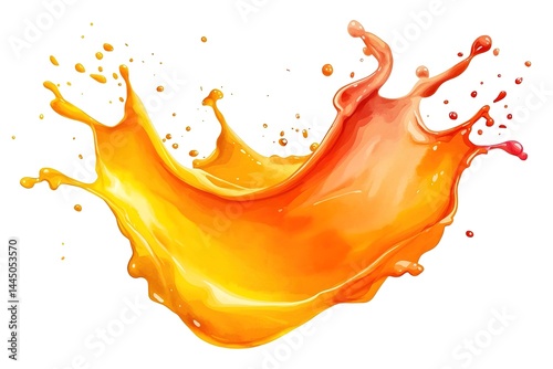 Abstract Orange Liquid Splash, Flowing Motion with Droplets Isolated on White Backdrop