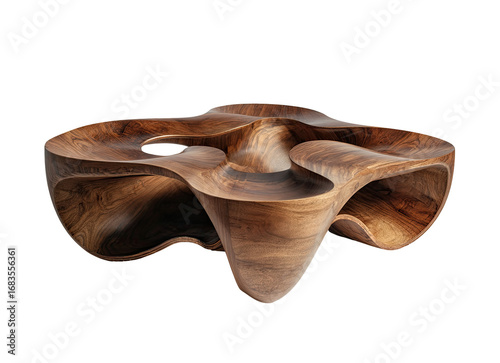 Abstract, organic coffee table carved from dark wood. Intricate, flowing curves create a surreal, undulating form. Smooth, polished surface
