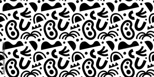 Abstract organic shape seamless pattern with black and white geometric doodles. Flat cartoon background, simple random shapes print texture.